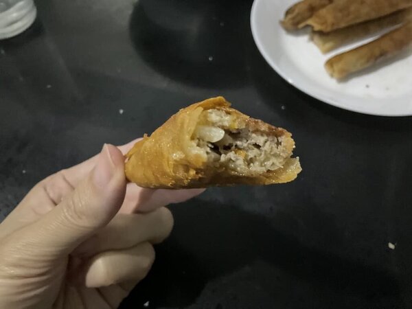 これが思ったよりも楽しくて、黙々と包む作業を続けました。皮の両端をカットして、具を乗せて、くるくる巻く...。完成したルンピアは、彼女が手際よく揚げてくれました。