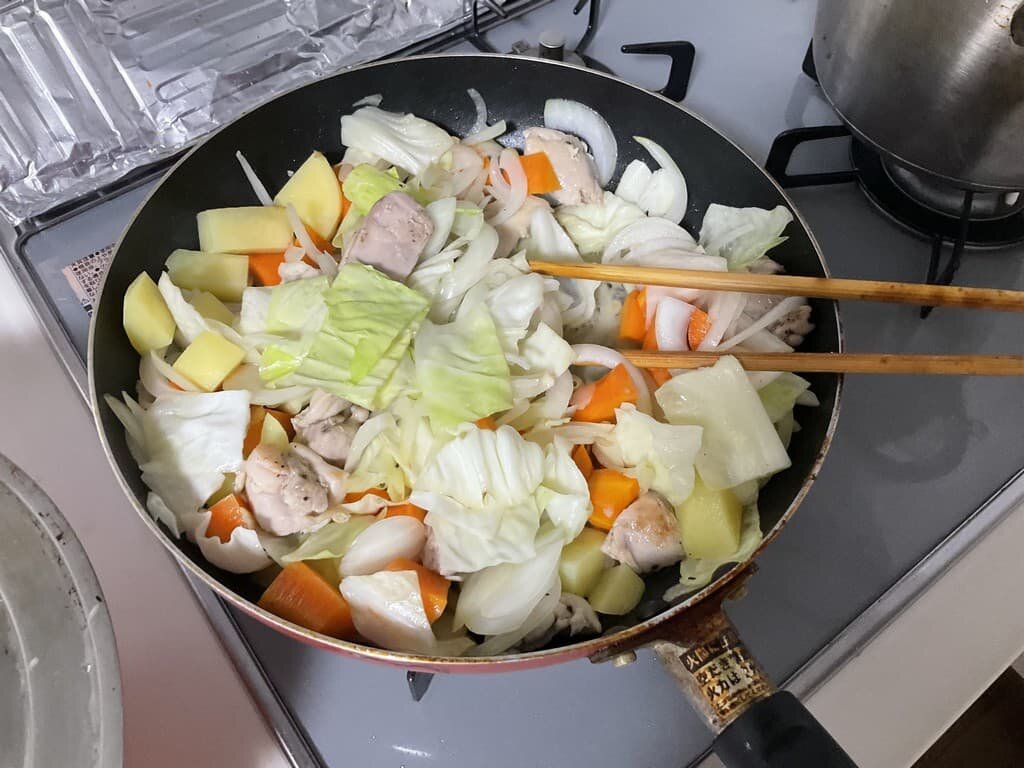 次に、カットしておいた玉ねぎ、じゃがいも、にんじん、キャベツを加え、鶏肉と一緒にさらに炒めます。