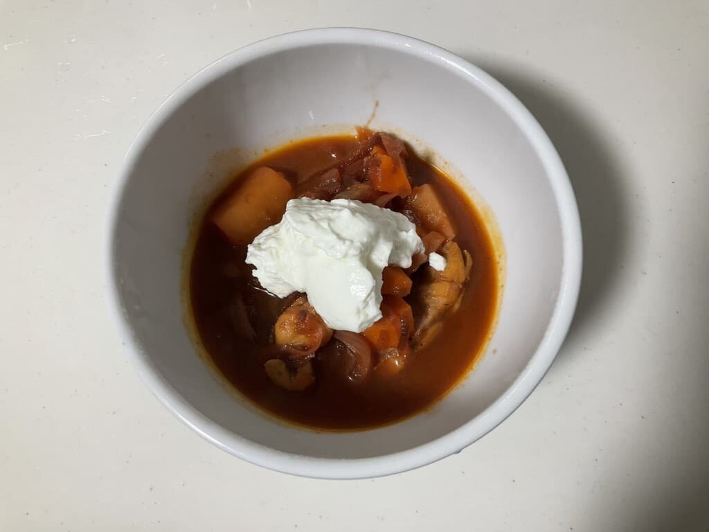 最後に、器に盛ったボルシチの上に、付け合わせとして買っておいたギリシャヨーグルトをトッピングしました。これで完成です。