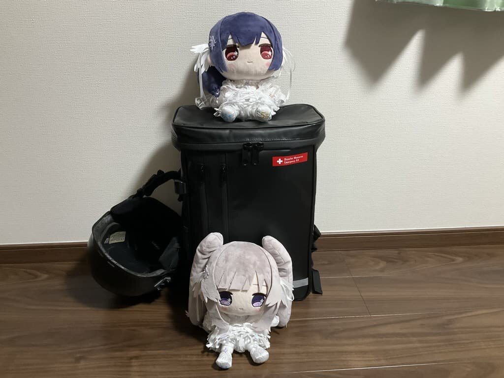 ヘルメットはリュックに連結し、いつでも持ち出せるようにしました。