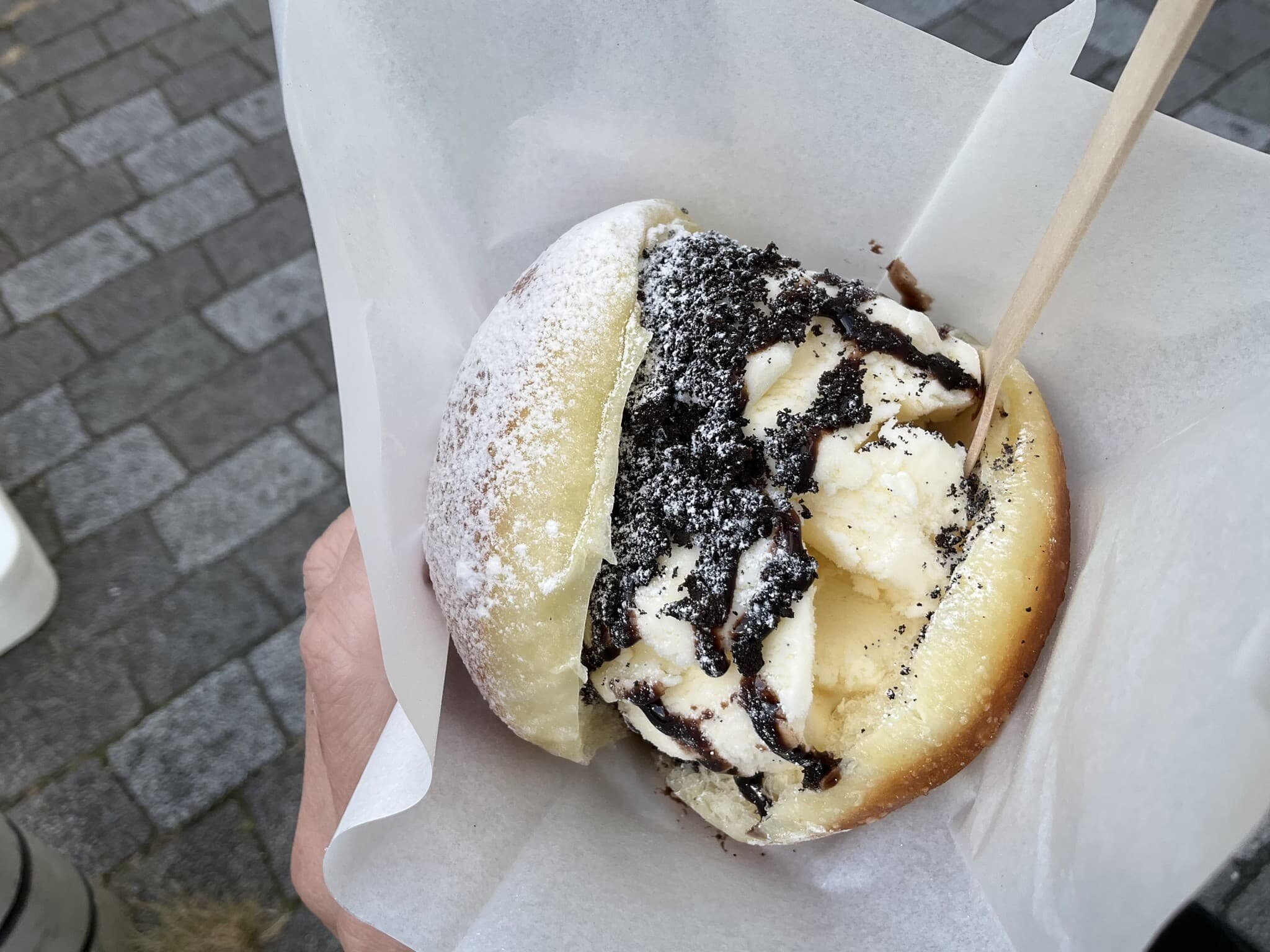 店の前のベンチが空いていたので、そこに腰を下ろして一人で食しました。揚げドーナツにアイスクリーム。甘いですし、間違いなくハイカロリーです。結局、これがこの日の昼食代わりになってしまいました。ぼんやりと甘いものを食べる時間は、今の自分にとってささやかな贅沢です。