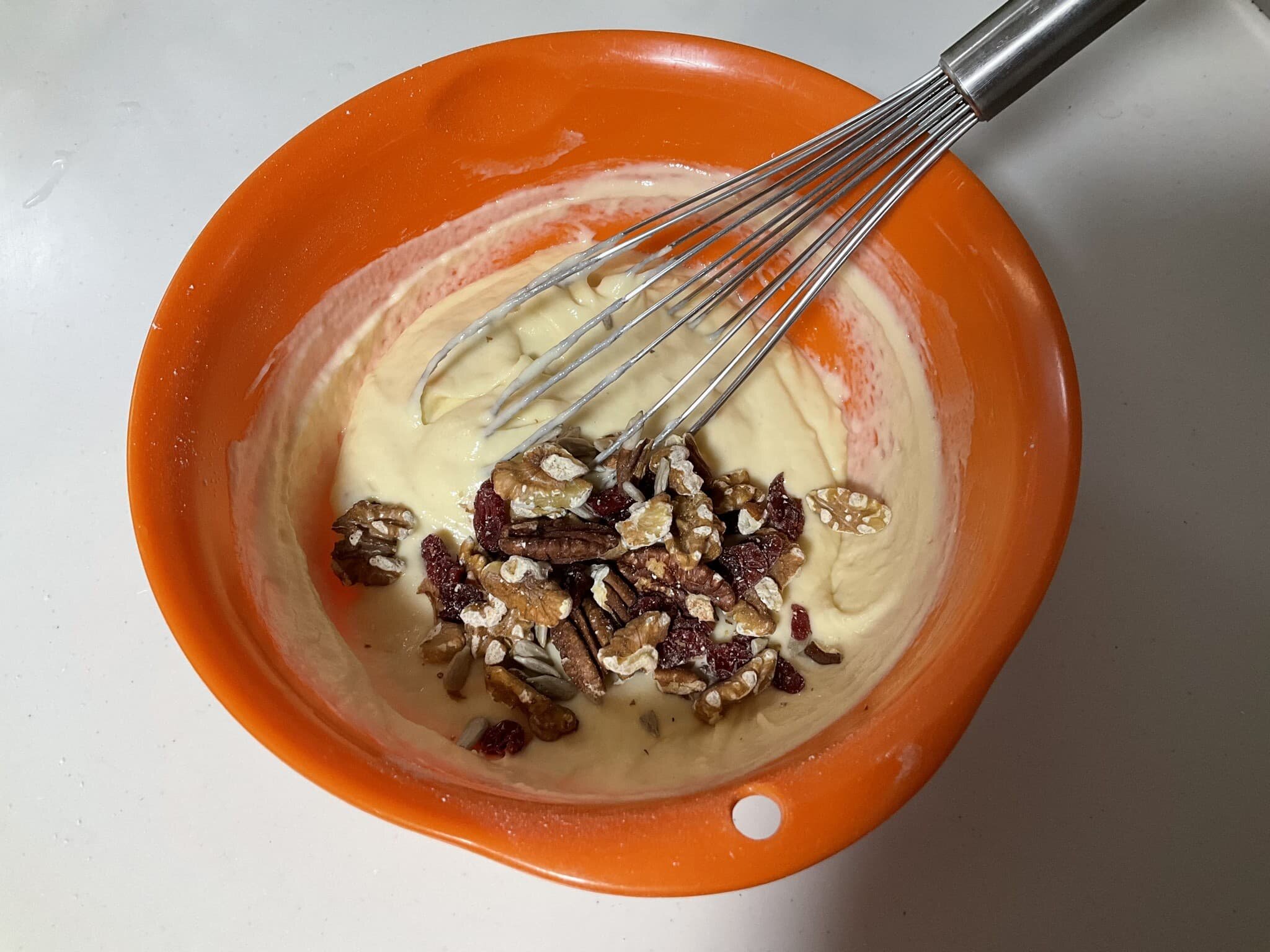 調理といっても、計量カップやキッチンスケールを使うような真似はしません。 ボウルに適当な粉と卵、ヨーグルトを入れ、そこに「くるみ&クランベリー」を投入するだけです。