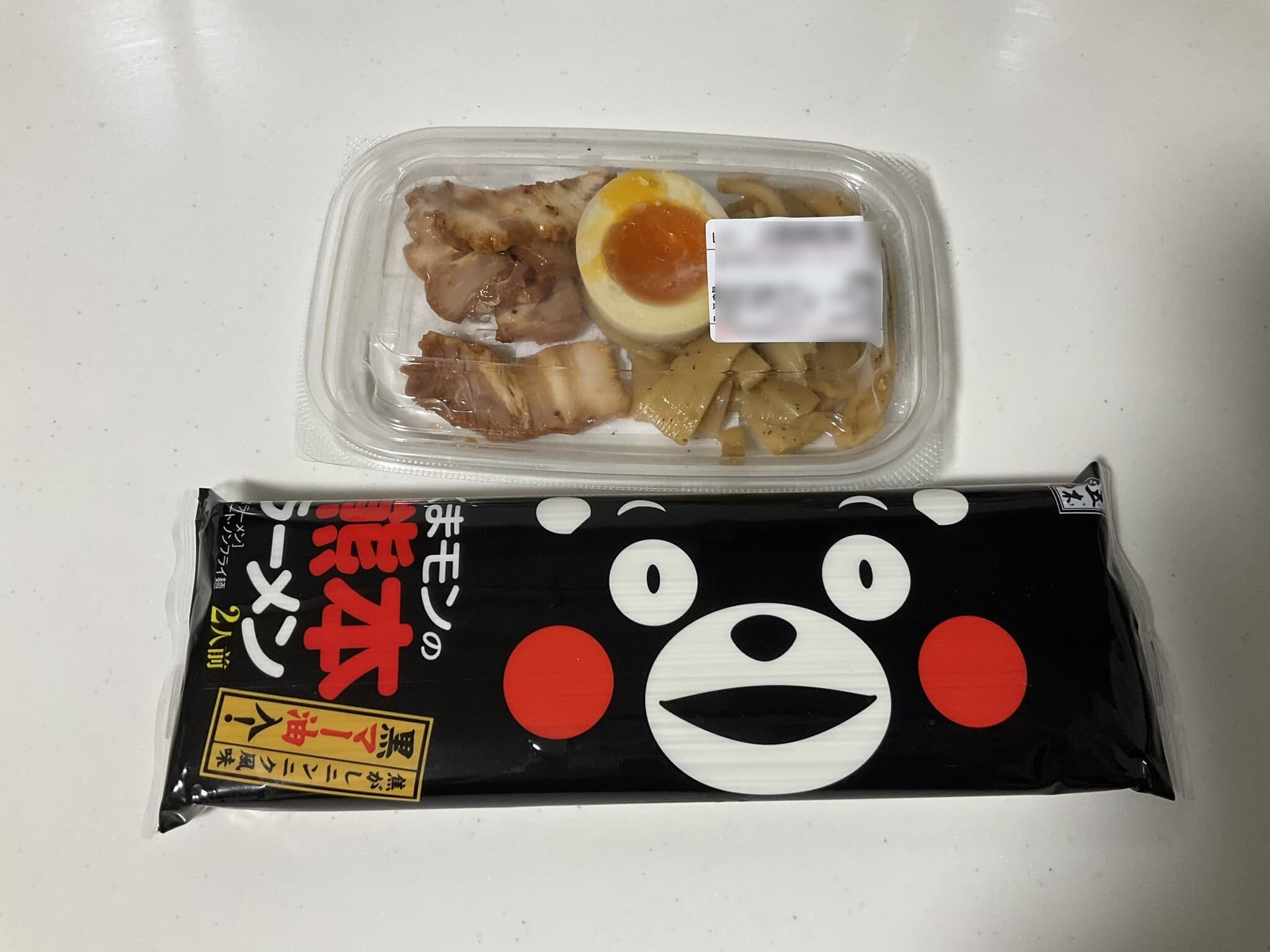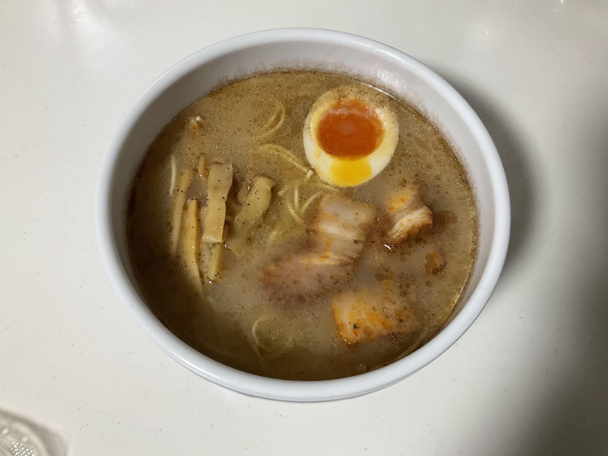 ピリ辛のチャーシューにシナチク、そして半分にカットされたゆで卵が入っています。 これを見た瞬間、ある使い道を思いつきました。これはそのまま食べるのではなく、ラーメンのトッピングにするのが最適解だと。
