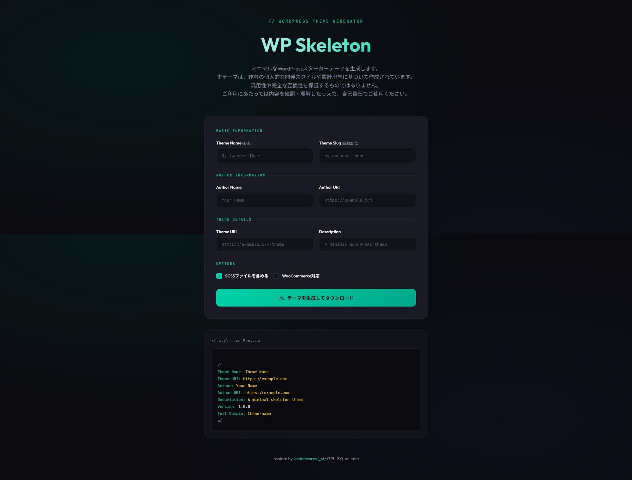 通常、スケルトンテーマといえば「Underscores.me」などが有名です。確かに汎用性は高いのですが、ダウンロードした後に自分好みにカスタマイズする手間が発生します。
