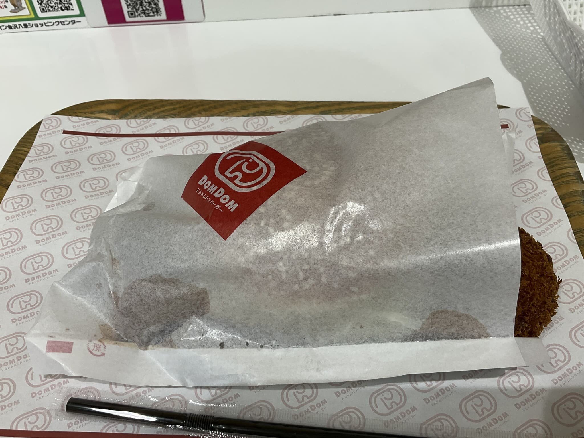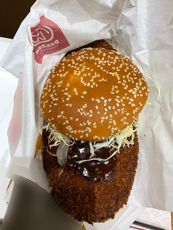メンチカツはバンズから大きくはみ出しており、包み紙を剥がせばソースが大惨事になることは明白でしたので、包み紙をはがずことなく写真に収めました。
