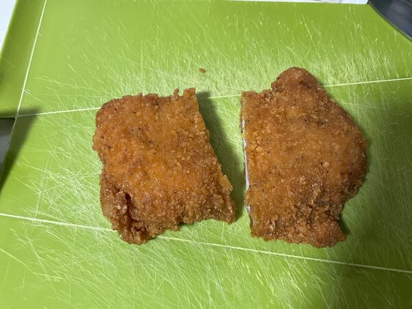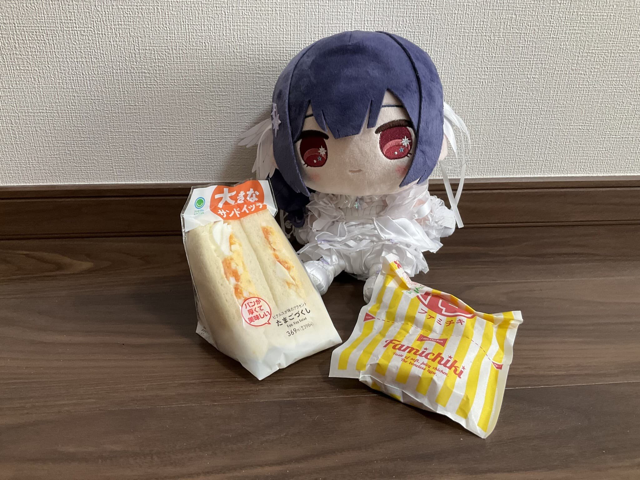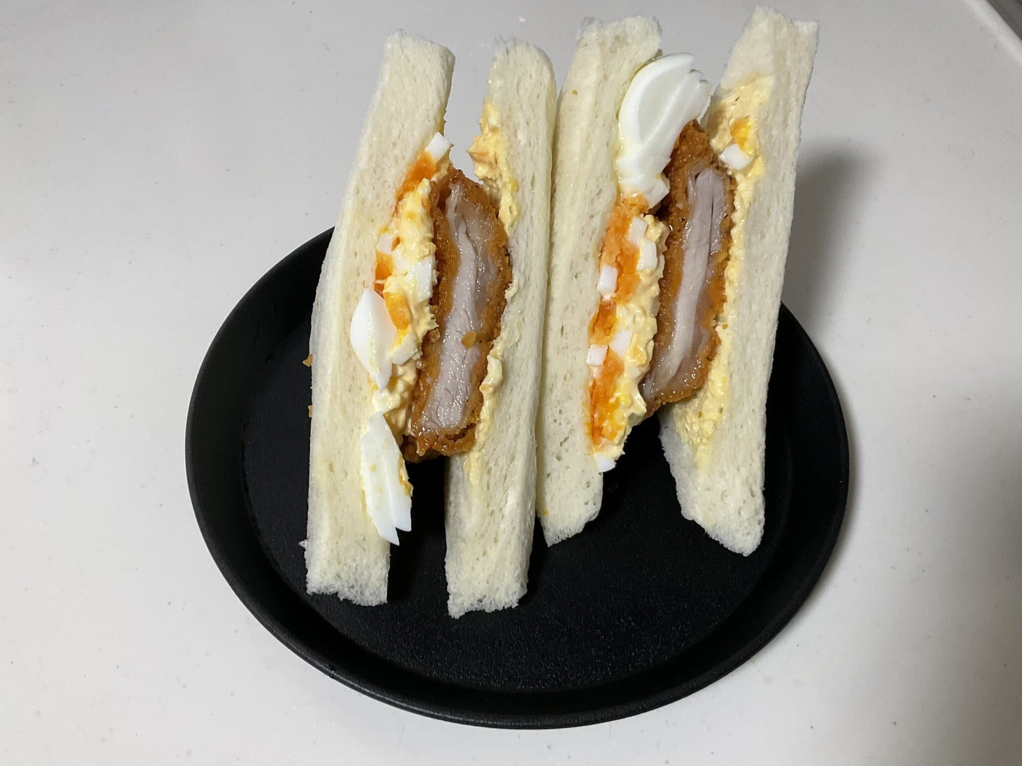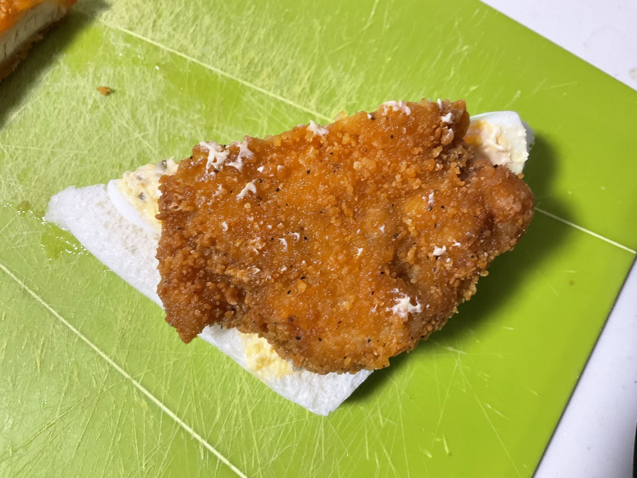 ファミリーマートで卵サンドと骨なしチキンを買い、骨なしチキンを半分に切って、卵サンドのパンをはがし、そこにチキンを挟む。それだけです。