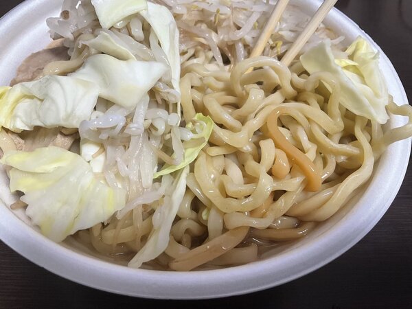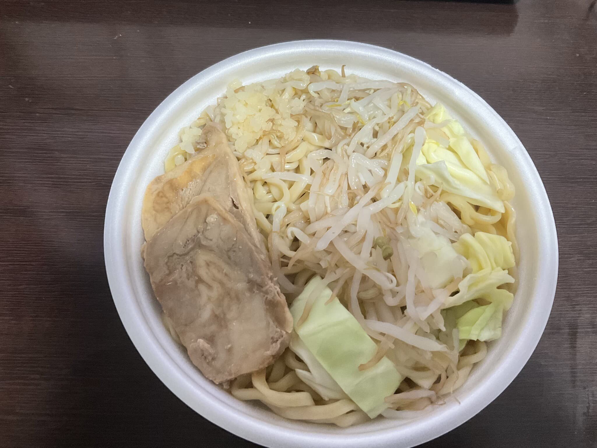 チャーシュー、もやし、キャベツ、ニンニク。麺は太めの縮れ麺でした。