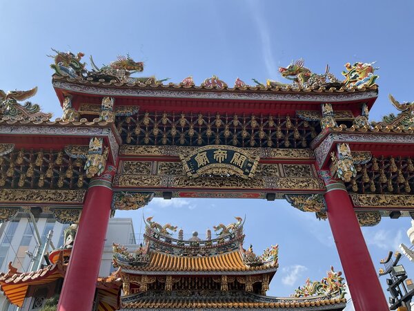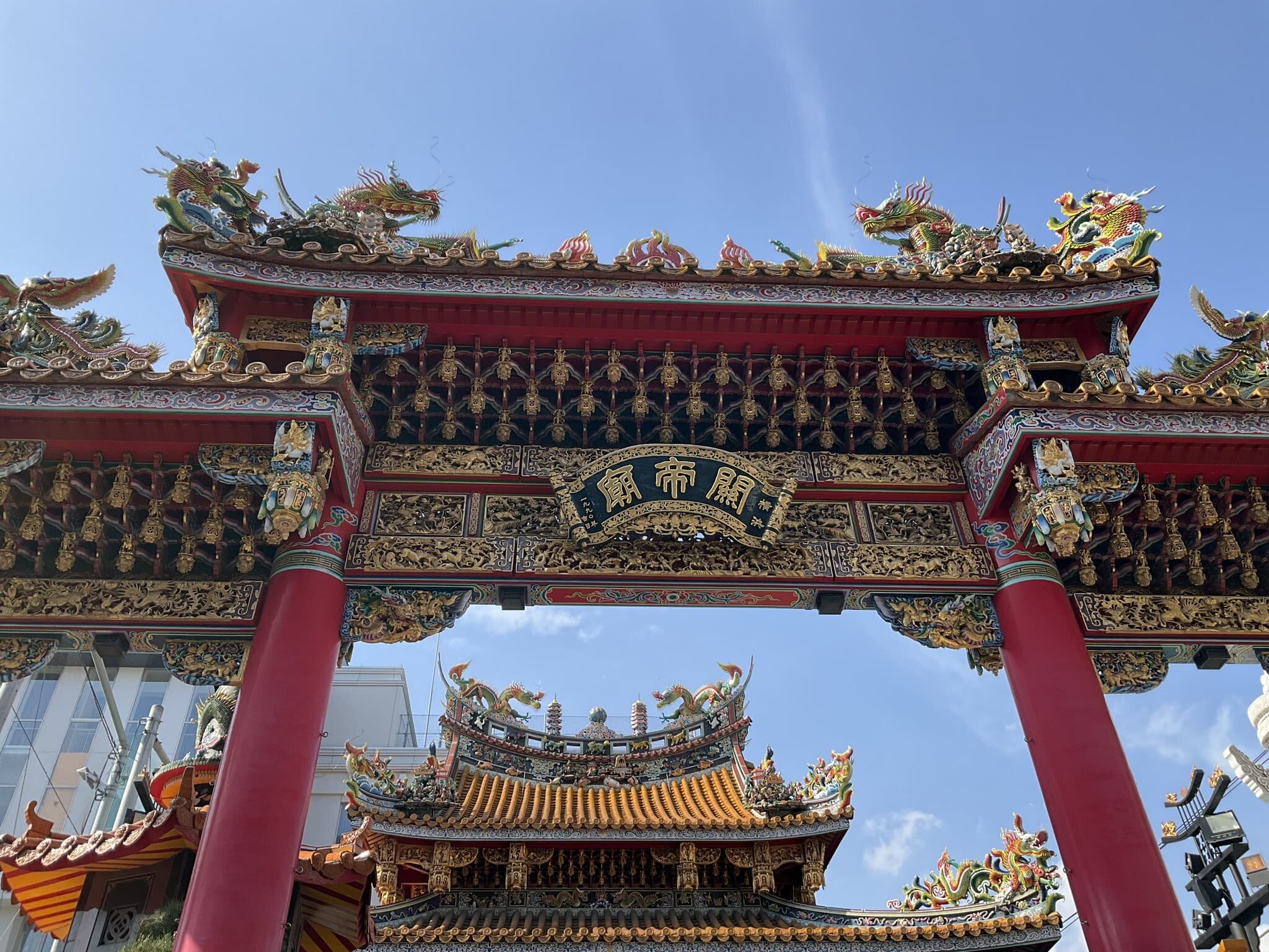 門の装飾は相変わらず派手で、見上げると龍や鳳凰の彫刻が青空の下にくっきりと映えていました。