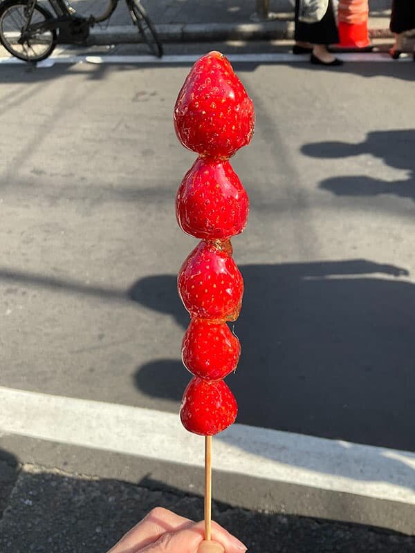 関帝廟を見学した後、ライブ会場へ向かうべく移動を開始しました。その途中、屋台でいちご飴が目に入りました。こういう場所でなければ買う機会もないので、一本買ってみました。